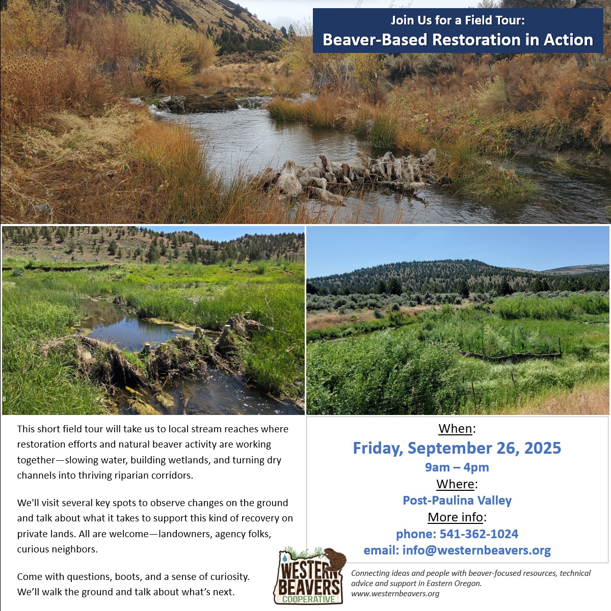 Join us Friday, September 26th from 9am-4pm to visit beaver-based restoration projects underway on private lands of the Crooked River Watershed.