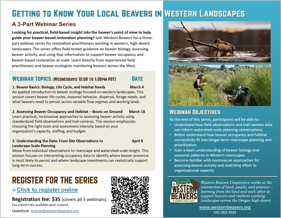 Join Western Beavers for a three-part webinar series for restoration practitioners working in western, high-desert landscapes. The series offers field-tested guidance on beaver biology, assessing beaver activity, and using that information to support beaver occupancy and beaver-based restoration at scale. Learn directly from experienced field practitioners and beaver ecologists monitoring beavers across the West.