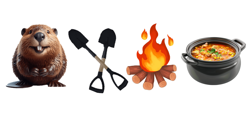 Tools, coffee/hot chocolate, chili pot, fire pit