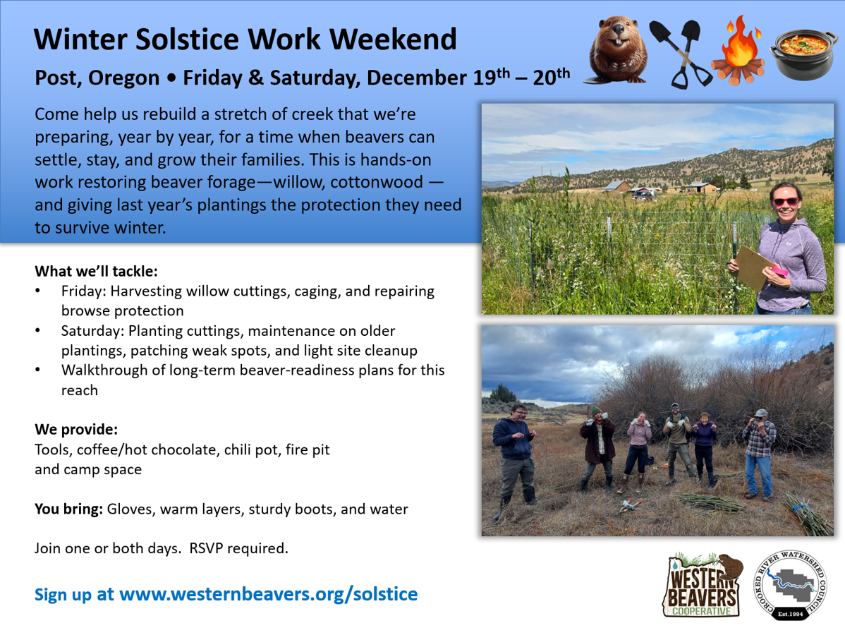 Come help us rebuild a stretch of creek that we’re preparing, year by year, for a time when beavers can settle, stay, and grow their families. This is hands-on work restoring beaver forage—willow, cottonwood —and giving last year’s plantings the protection they need to survive winter.